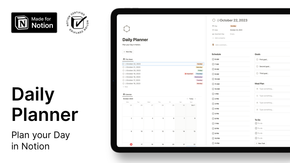 Streamline your daily routine and boost productivity with our all-in-one Notion Daily Planner Template. This comprehensive tool empowers you to efficiently manage your schedule, plan your meals, track your to-dos, and set and achieve your daily goals, all in one convenient digital space. Take charge of your day, stay organized, and make the most of every moment with this user-friendly template.