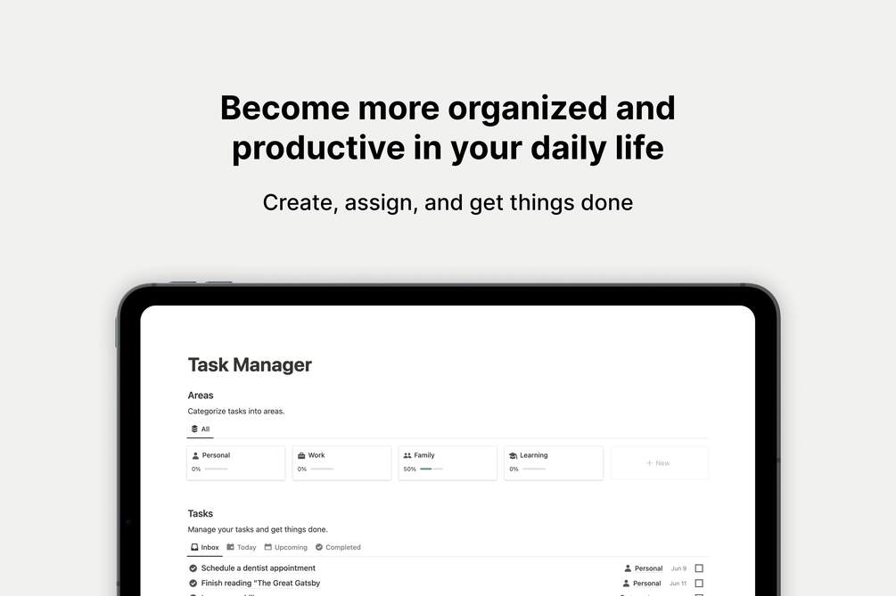 Use this Notion Task Manager to become more organized and productive in your daily life. Create and assign your task, and get things done.